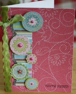 I just love this site of Lindsey's since I discovered her over at Splitcoast Stampers. I completed her challenge today with a new punch that I picked up yesterday. I just love playing with embellies. Have you seen and used these new silk ribbons, they are so fabulous to work with. Thanks for looking.