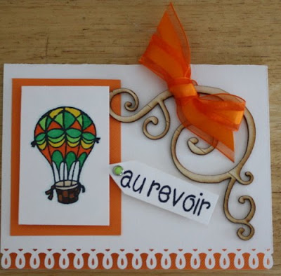 Here is an other card with that wonderful Bon Voyage set. I loved the richness of the colors in this photo. I was glad to use one of the wood embellishments that I have been hoarding. I am also having fun playing with the Martha Stewart border punches. Thanks for looking and have a great day. If you came here from Meredith's blog then you are right on track and next you will be going to Nina's blog If not, you should start the blog hop from the beginning at the Queen Kat Design blog.Hugs,