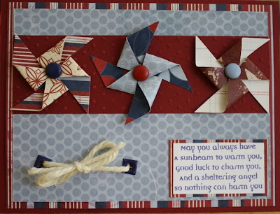 Pinwheels are really easy to make. You can use any size square that you want. I used a 1.5" square and then cut on the four diagonal lines to within about a 1/4 of an inch. You then fold alterating pieces toward the center. I held them in place and punched a hole for my brad.