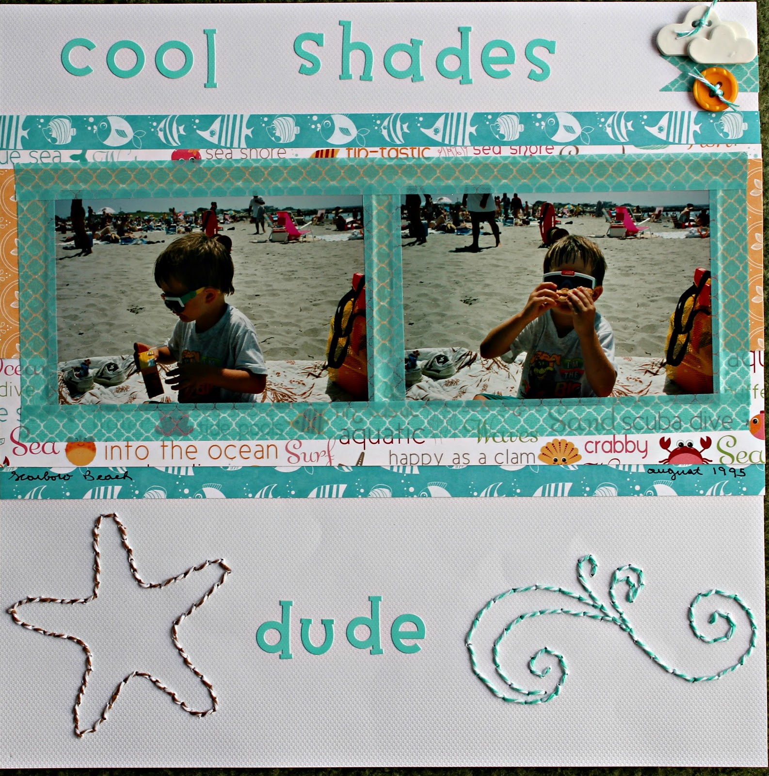 9. Cut fancy border strip 4 X 5 1/4" and adhere across the notebook paper and over top of the acetate. Staple into place.
