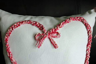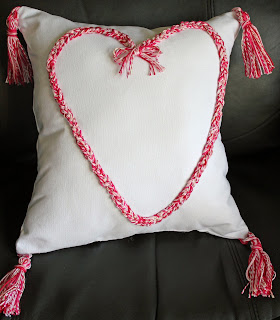 Next to Christmas, Valentine's Day is my most favorite holiday.  I decided to have some fun playing with twine from The Twinery.  I finger knit 7 different colors of twine together to  make the chain to form the heart.  I also used those same colors to create the tassels as well.