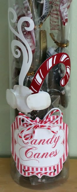 I am so tickled with how this came out.  This is for a dear friend who is getting a hot chocolate set as part of her gift for Christmas.  Silhouette empty tube from stencil vinyl and etching tape Cut files: candy cane cupcake wrapper 51711 Tag 13434