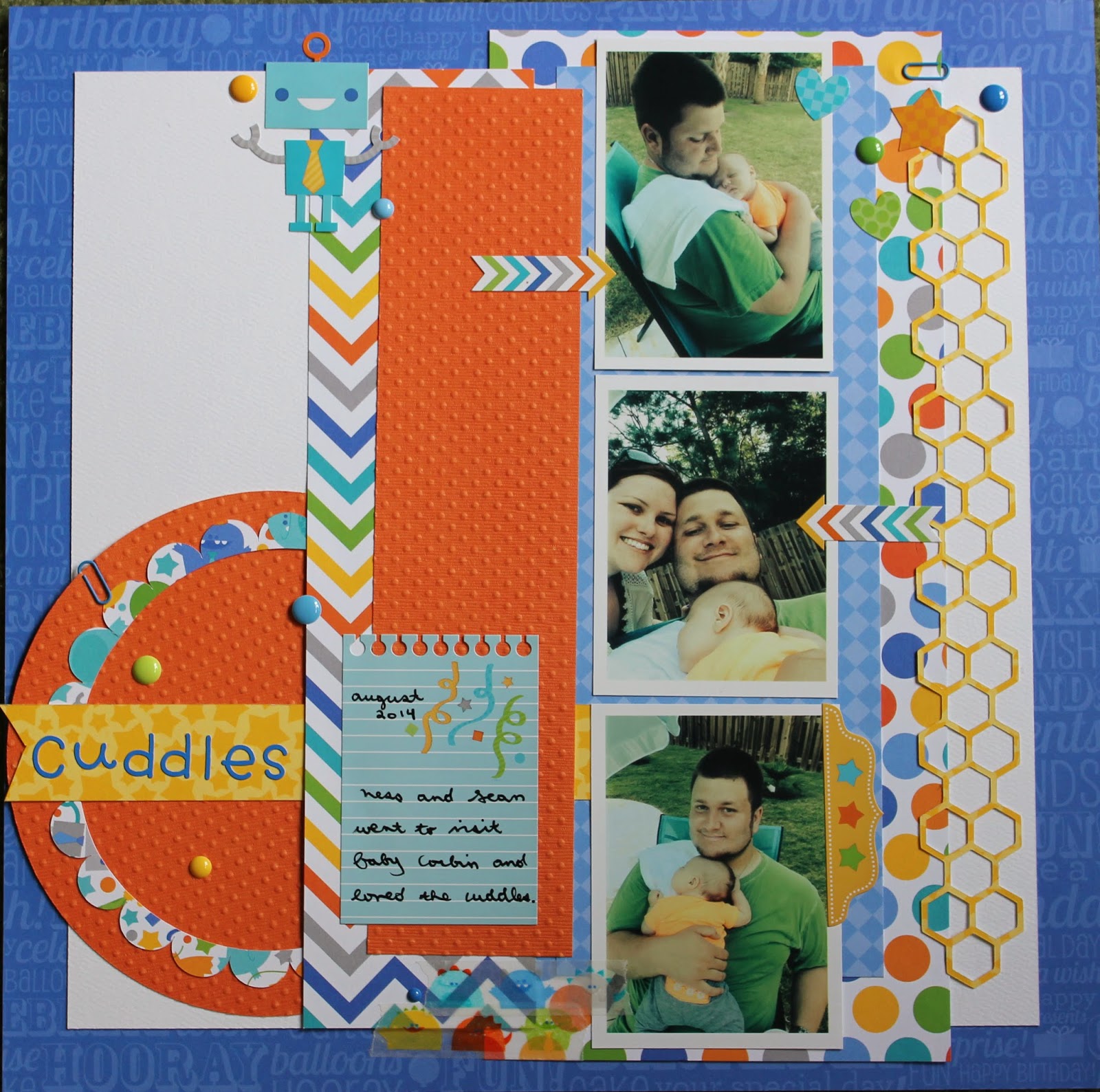 Created this layout of Sean and Vanessa's visit to meet her newest cousin, Corbin. They are going to make great parents some day and seeing Sean hold this baby so lovingly makes me melt and look forward to the day when they have their own baby. I used the Doodlebug Essentials Hip Hip Hooray kit for this layout. I was challenged to use products using the word labor.