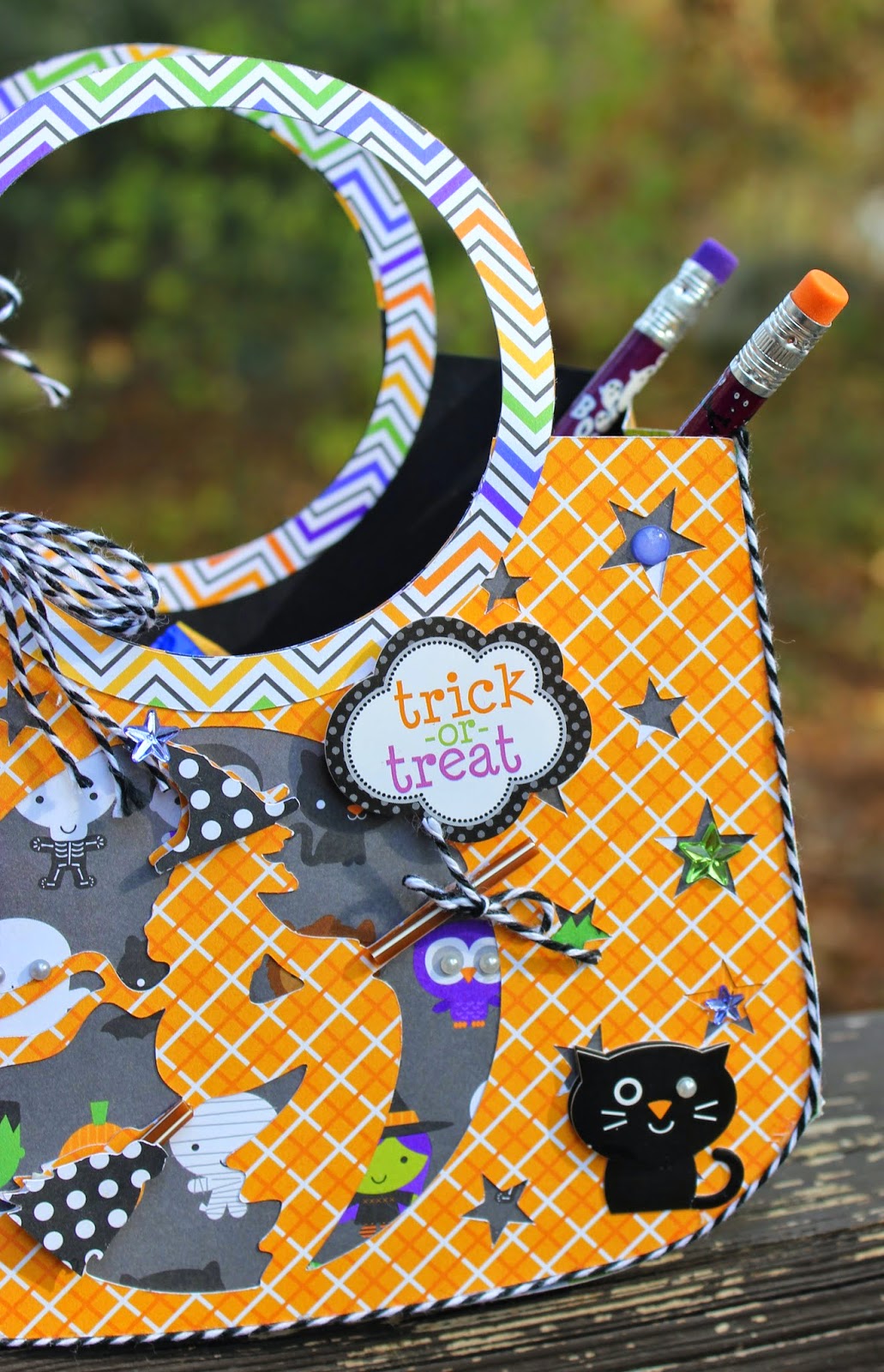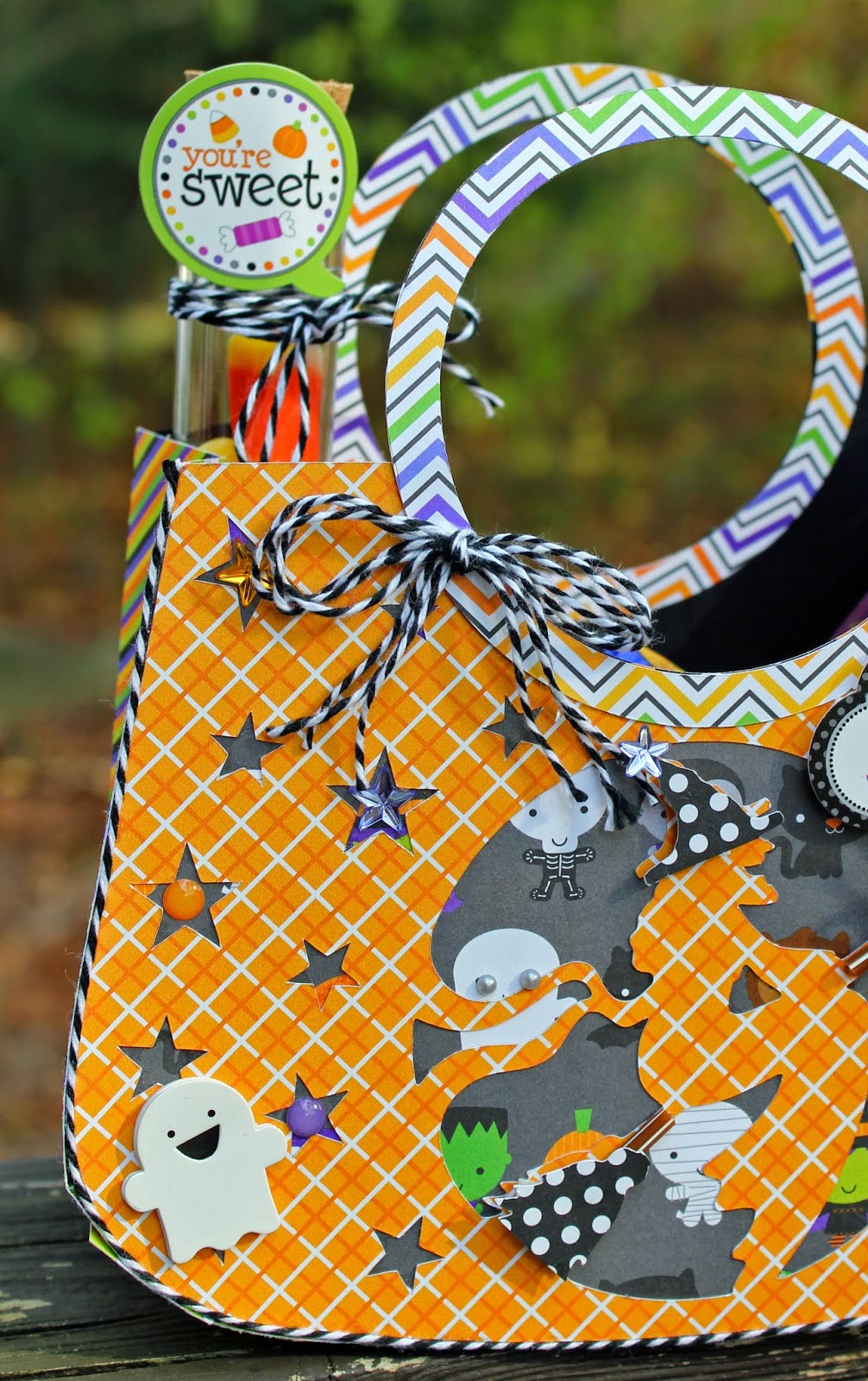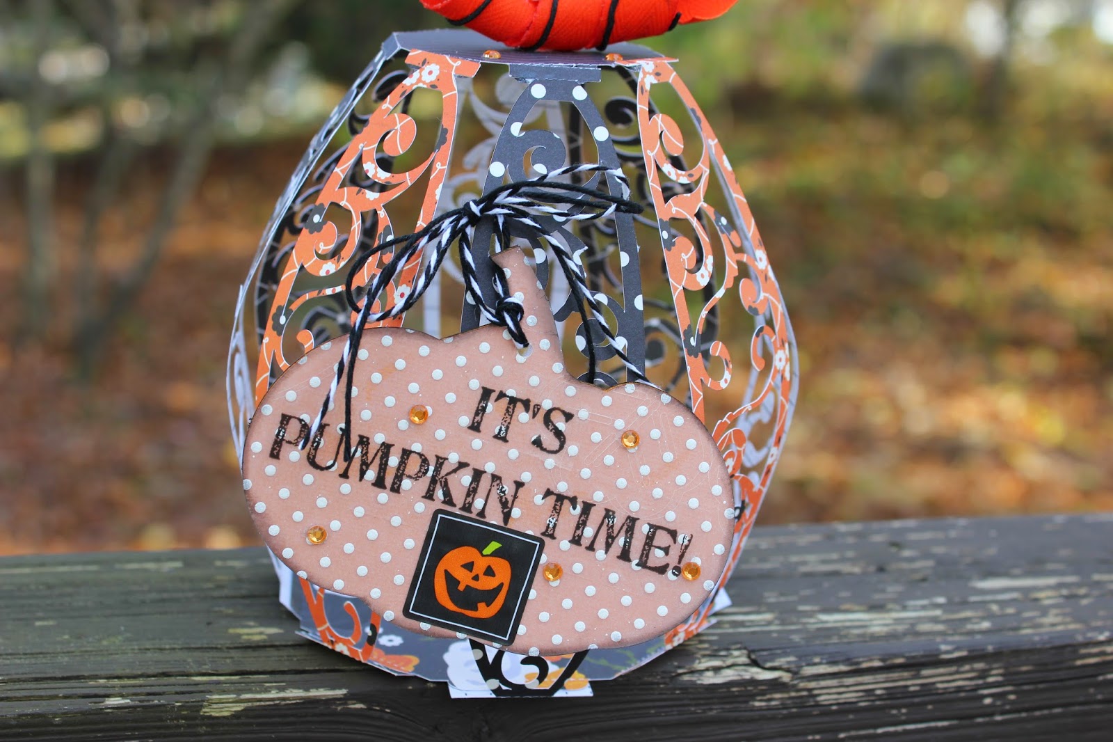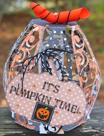 I used my Silhouette Cameo to die cut the box, the pumpkin and the leaves to make a holder for my goodies. I was trying to come up with something that looked like the boxes that kids get their popcorn, snack and drink in at the movies. The popcorn is actually a caramel one which also fits nicely with the season.