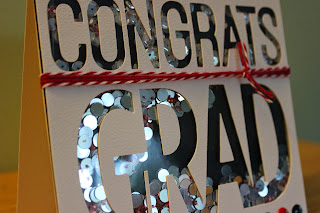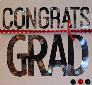 My son just graduated from Northeastern University in Boston and his school colors are red, white and black. I used my Silhouette to create the card front with the words cut out. I adore shaker cards and thought this would be something different for him. I used the Sparkling Clear sequins and Silver Confetti along with a touch of glitter from Melissa Frances. I finished off my card with some twine from The Twinery and some enamel dots from Doodlebug.