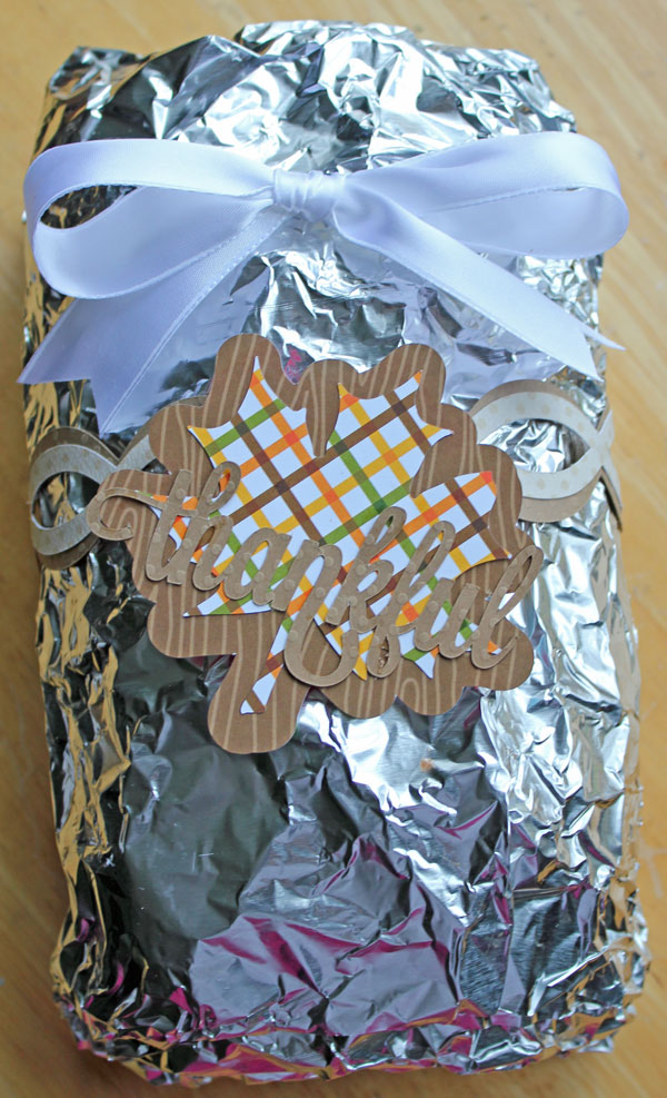 I used the cut file called Thankful short envelope bag by Jamie Cripps for the top decoration. I know that Thanksgiving is over but this would be a fun way to decorate your winter holiday gift breads.