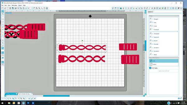 I took the bracelet cut file and put it on my mat. I then chose the knife tool and cut the end of the bracelet with the side you put the tab into off. I wanted two layers to my band so did the same to both files. I measured my bread so that I knew how many of the bands I needed to cut.