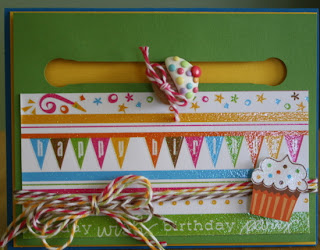 For my second card I used an oldie but goodie card technique that I just love. It is a slider card. I used one of Stephanie's cupcake buttons and mounted the back on a penny and then put a pop dot on the back and then added the second penny. I slipped this set into the track that I created on my card and my cupcake slides from one end of the card to the other. These are some older Creative Imaginations papers that I have just been waiting for the right opportunity to use.