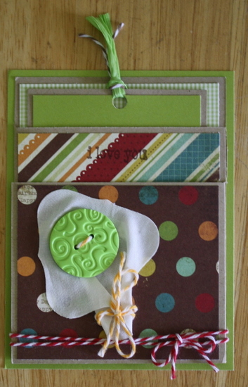 For my third card I made a pocket card. I used one of Stephanie's larger buttons and thought this card would be perfect for my dear hubby. I love these Simple Stories papers for male cards.